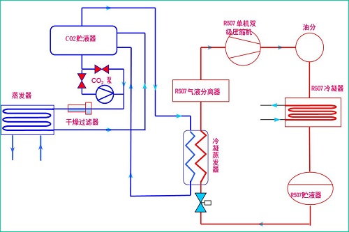 CO2載冷劑系統(tǒng)主要由R507制冷壓縮機(jī)組、R507輔機(jī)、R507輔機(jī)、電氣控制四部分構(gòu)成